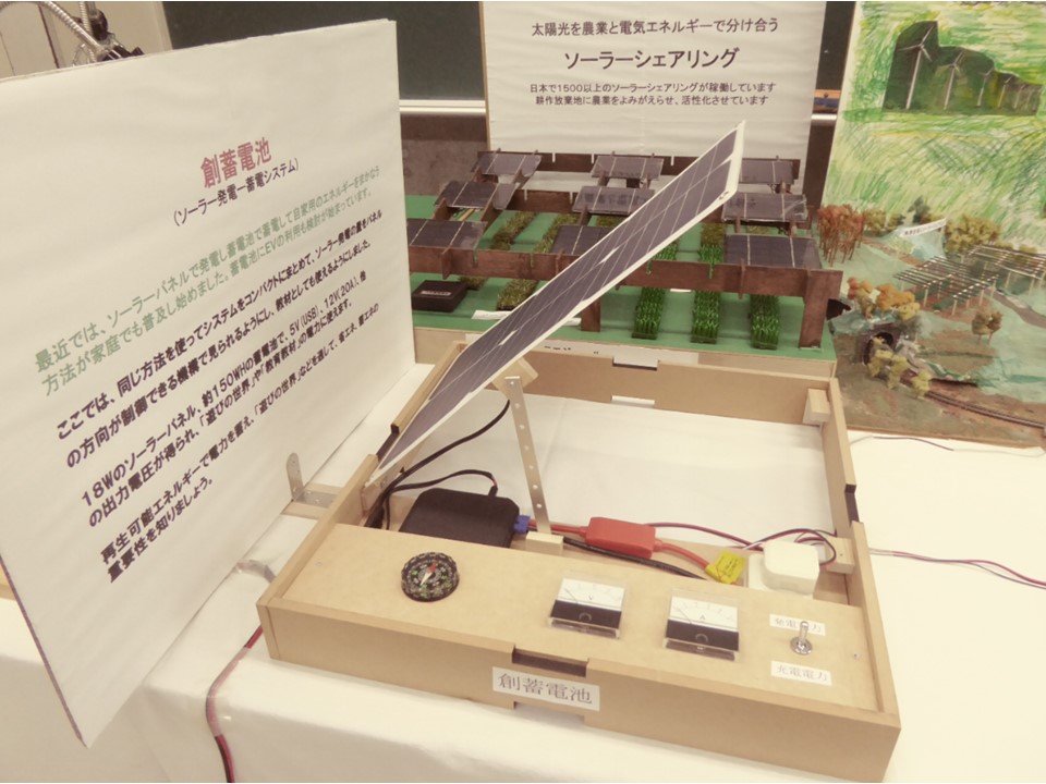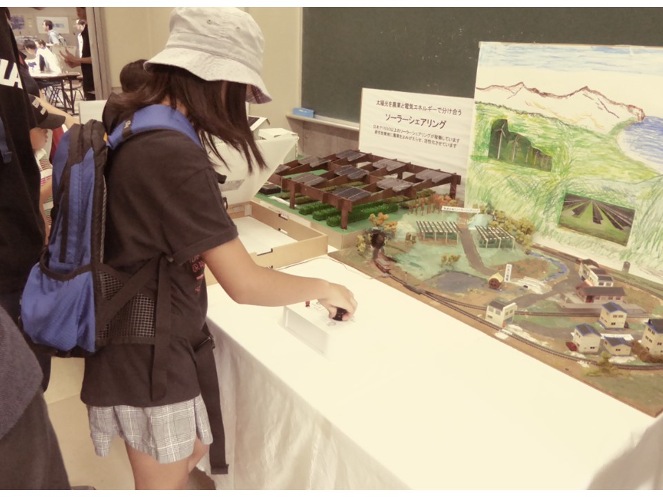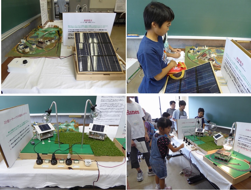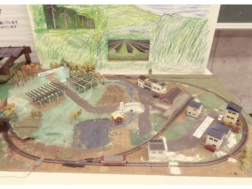 これからの「自然エネルギーの世界」の動きとして、ポスターとジオラマで「電気飛行機」と「ソーラーシェアリング」に焦点を当てました.