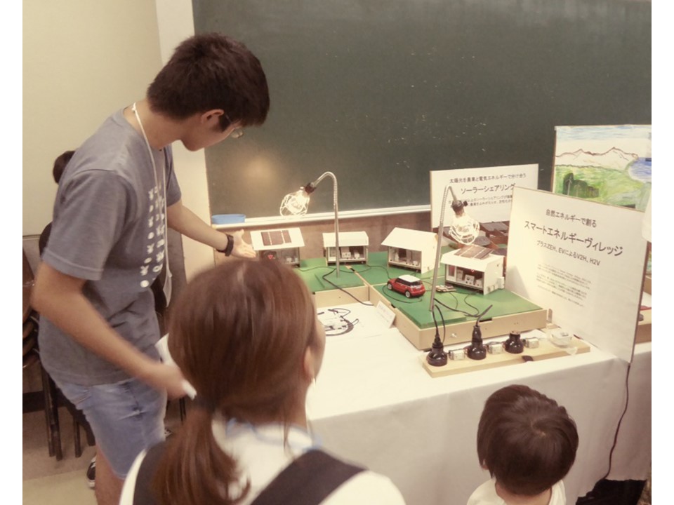 ここでは、子どもたちに地域配電網により、小水力発電・電気自動車・燃料電池・ソーラーハウスの連携で、将来的には地域のエネルギーが地域でまかなえる可能性についてハンズオンしながら考えてもらいました.写真