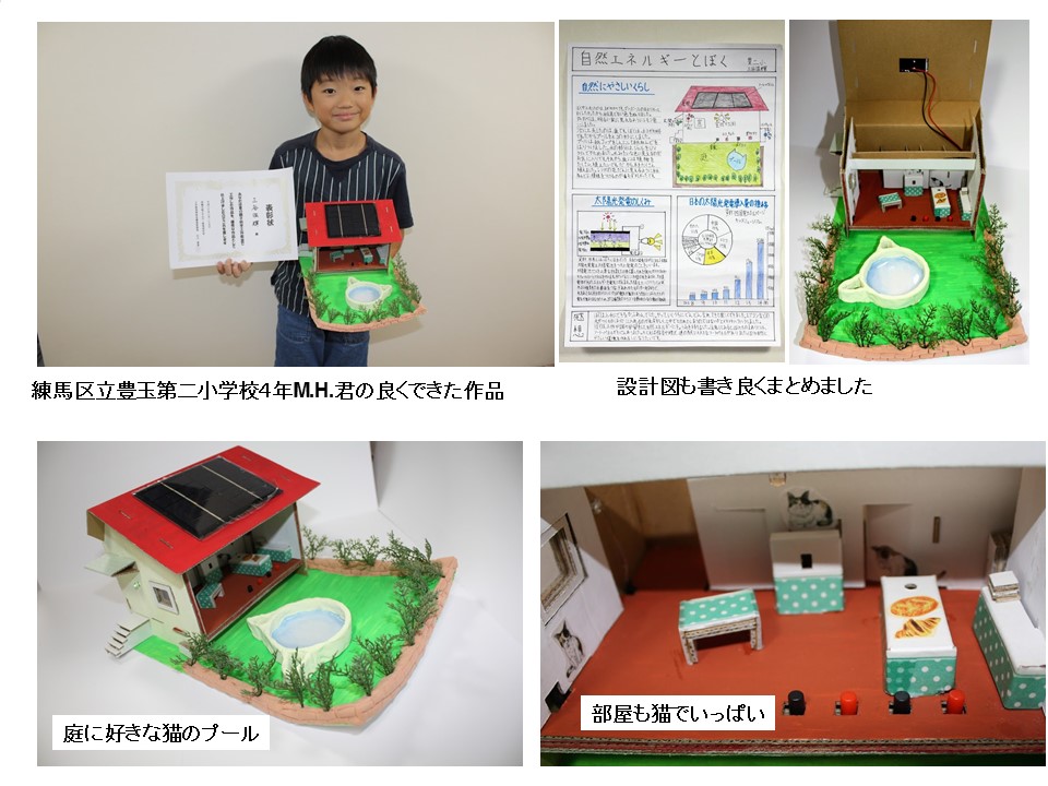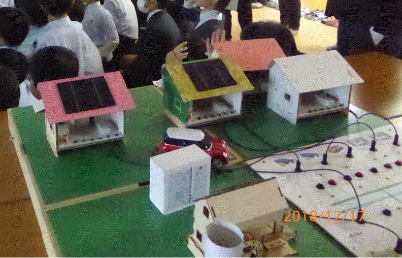 さらにこのコーナーでは、「自然エネルギーの世界」では分散型エネルギーの利用の場としてのコミュニティーが大切であることを表わすため、工作教室で作った「ゼロエネルギーハウス(ZEH)」をベースにマイコンで制御し、「スマートエネルギーヴィレッジ」の模型 を構成しました.