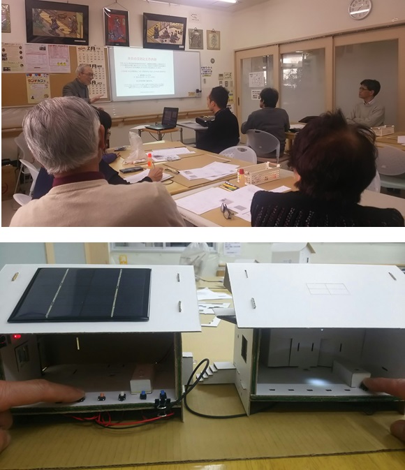 日時:2018年2月25日(日)、NPO法人みたか市民共同発電と共催で、みたか発電のメンバーを対象にソーラーハウスの工作教室を開催しました.